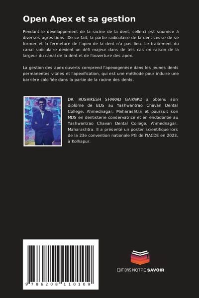 Pendant le développement de la racine de la dent, celle-ci est soumise à diverses agressions. De ce fait, la partie radiculaire de la dent cesse de se former et la fermeture de l'apex de la dent n'a pas lieu. Le traitement du canal radiculaire devient un défi majeur dans de tels cas en raison de la largeur du canal de la dent et de l'ouverture des apex.La gestion des apex ouverts comprend l'apexogenèse dans les jeunes dents permanentes vitales et l'apexification, qui est une méthode pour induire une barrière calcifiée dans la partie de la racine des dents.