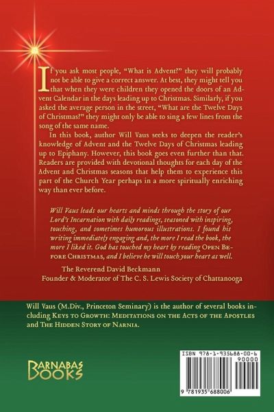 If you ask most people, "What is Advent?" they will probably not be able to give a correct answer. At best, they might tell you that when they were children they opened the doors of an Advent Calendar in the days leading up to Christmas. Similarly, if you asked the average person in the street, "What are the Twelve Days of Christmas?" they might only be able to sing a few lines from the song of the same name. In this book, author Will Vaus seeks to deepen the reader's knowledge of Advent and the Twelve Days of Christmas leading up to Epiphany. However, this book goes even further than that. Readers are provided with devotional thoughts for each day of the Advent and Christmas seasons that help them to experience this part of the Church Year perhaps in a more spiritually enriching way than ever before. "Will Vaus leads our hearts and minds through the story of our Lord's Incarnation with daily readings, seasoned with inspiring, touching, and sometimes humorous illustrations. I found his writing immediately engaging and, the more I read the book, the more I liked it. God has touched my heart by reading OPEN BEFORE CHRISTMAS, and I believe he will touch your heart as well." Rev. David Beckmann, Founder of The C. S. Lewis Society of Chattanooga Will Vaus (M.Div., Princeton Seminary) is the author of several books in¬cluding KEYS TO GROWTH: MEDITATIONS ON THE ACTS OF THE APOSTLES and THE HIDDEN STORY OF NARNIA.