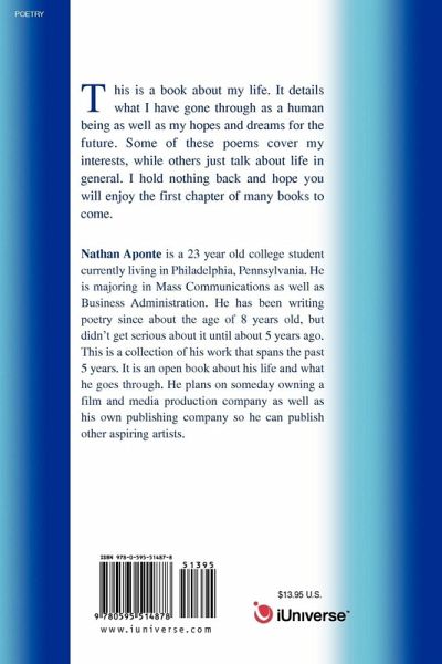 This is a book about my life. It details what I have gone through as a human being as well as my hopes and dreams for the future. Some of these poems cover my interests, while others just talk about life in general. I hold nothing back and hope you will enjoy the first chapter of many books to come.