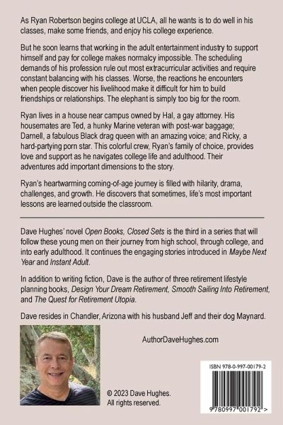 As Ryan Robertson begins college at UCLA, all he wants is to do well in his classes, make some friends, and enjoy his college experience. But he soon learns that working in the adult entertainment industry to support himself and pay for college makes normalcy impossible. The scheduling demands of his profession rule out most extracurricular activities and require constant balancing with his classes. Worse, the reactions he encounters when people discover his livelihood make it difficult for him to build friendships or relationships. The elephant is simply too big for the room. Ryan lives in a house near campus owned by Hal, a gay attorney. His housemates are Ted, a hunky Marine veteran with post-war baggage; Darnell, a fabulous Black drag queen with an amazing voice; and Ricky, a hard-partying porn star. This colorful crew, Ryan's family of choice, provides love and support as he navigates college life and adulthood. Their adventures add important dimensions to the story. Ryan's heartwarming coming-of-age journey is filled with hilarity, drama, challenges, and growth. He discovers that sometimes, life's most important lessons are learned outside the classroom. Open Books, Closed Sets continues the engaging stories introduced in Maybe Next Year and Instant Adult. Content advisory: This book contains adult language and references to pornography, same-sex sexual activities, and recreational drug abuse. It does not contain graphic sex scenes. If it were a movie, it would be rated R. This book may not be suitable for readers under 18.