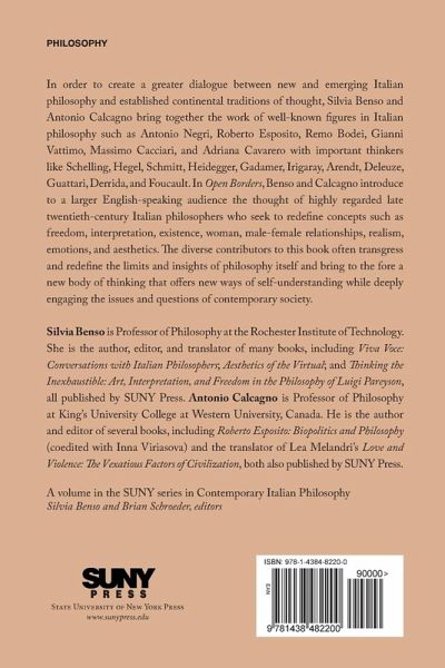Silvia Benso is Professor of Philosophy at the Rochester Institute of Technology. She is the author, editor, and translator of many books, including Viva Voce: Conversations with Italian Philosophers; Aesthetics of the Virtual; and Thinking the Inexhaustible: Art, Interpretation, and Freedom in the Philosophy of Luigi Pareyson, all published by SUNY Press. Antonio Calcagno is Professor of Philosophy at King's University College at Western University, Canada. He is the author and editor of several books, including Roberto Esposito: Biopolitics and Philosophy (coedited with Inna Viriasova) and the translator of Lea Melandri's Love and Violence: The Vexatious Factors of Civilization, both also published by SUNY Press.