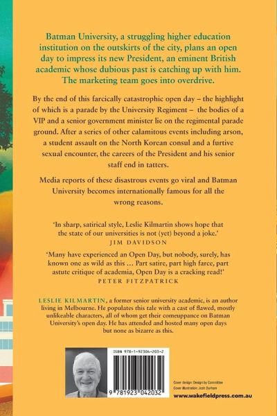 Leslie Kilmartin, a former senior university academic, is an author living in Melbourne. He populates this tale with a cast of flawed, mostly unlikeable characters, all of whom get their comeuppance on Batman University's open day. He has attended and hosted many open days but none as bizarre as this.