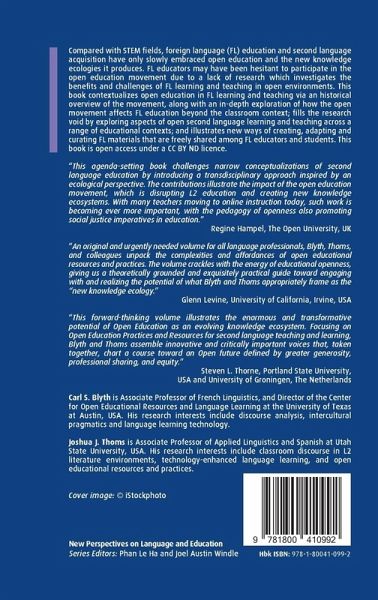 This book contextualizes open education in foreign language (FL) learning and teaching; fills a gap in the research by exploring aspects of open second language learning and teaching across a range of educational contexts; and illustrates new ways of creating freely shared FL materials. This book is open access under a CC BY ND licence.