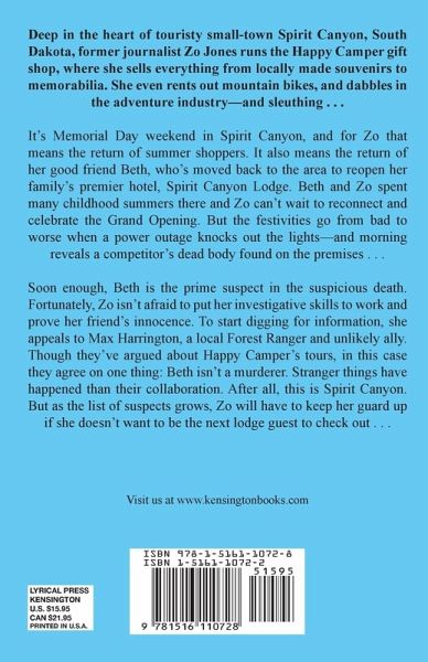 Deep in the heart of touristy small-town Spirit Canyon, South Dakota, former journalist Zo Jones runs the Happy Camper gift shop, where she sells everything from locally made souvenirs to memorabilia. She even rents out mountain bikes, and dabbles in the adventure industry—and sleuthing . . . It’s Memorial Day weekend in Spirit Canyon, and for Zo that means the return of summer shoppers. It also means the return of her good friend Beth, who’s moved back to the area to reopen her family’s premier hotel, Spirit Canyon Lodge. Beth and Zo spent many childhood summers there and Zo can’t wait to reconnect and celebrate the Grand Opening. But the festivities go from bad to worse when a power outage knocks out the lights—and morning reveals a competitor’s dead body found on the premises . . . Soon enough, Beth is the prime suspect in the suspicious death. Fortunately, Zo isn’t afraid to put her investigative skills to work and prove her friend’s innocence. To start digging for information, she appeals to Max Harrington, a local Forest Ranger and unlikely ally. Though they’ve argued about Happy Camper’s tours, in this case they agree on one thing: Beth isn’t a murderer. Stranger things have happened than their collaboration. After all, this is Spirit Canyon. But as the list of suspects grows, Zo will have to keep her guard up if she doesn’t want to be the next lodge guest to check out . . .