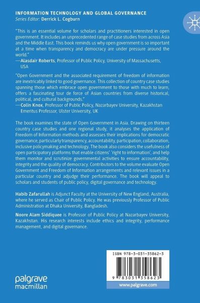 Part I: Introduction.- 1. Introduction: The Idea of Open Government and Freedom of Information.- 2. The Context of Open Government and Freedom of Information in Asia.- Part II: Southeast Asia.- 3. Leaning Toward the Light? The Path to Open Government in Taiwan.- 4. Open Government and Freedom of Information: The Philippine Experience.- 5. Open Government in Hong Kong.- 6. Waves of Democratization in the Malaysian Political Space: Access to Information.- 7. Open Government in Thailand: Implications for Democratic Governance.- 8. Open Government Data and Smart Nation in Singapore.- 9. Right to Information and Open Government in Indonesia.- Part III: South Asia.- 10. Toward a Framework for Social Equity and Inclusion in Right to Information Legislation: The Case of India.- 11. The Practice of Open Government and Right to Information in Bangladesh.- 12. Open Government in Federal Nepal: Challenges, Constraints, and Opportunities.- Part IV: The Middle East andCentral Asia.- 13. An Analysis of the Digital Transformation in Public Organizations: The Case of the United Arab Emirates.- 14. Open Government in Kazakhstan: Does It Ensure Freedom of Information?.- 15. Open Government Data Initiatives in the GCC Constituents.