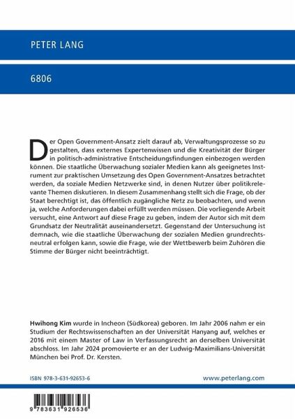 Der Open Government-Ansatz zielt darauf ab, Verwaltungsprozesse so zu gestalten, dass externes Expertenwissen und die Kreativität der Bürger in politisch-administrative Entscheidungsfindungen einbezogen werden können. Die staatliche Überwachung sozialer Medien kann als geeignetes Instrument zur praktischen Umsetzung des Open Government-Ansatzes betrachtet werden, da soziale Medien Netzwerke sind, in denen Nutzer über politikrelevante Themen diskutieren. In diesem Zusammenhang stellt sich die Frage, ob der Staat berechtigt ist, das öffentlich zugängliche Netz zu beobachten, und wenn ja, welche Anforderungen dabei erfüllt werden müssen. Die vorliegende Arbeit versucht, eine Antwort auf diese Frage zu geben, indem der Autor sich mit dem Grundsatz der Neutralität auseinandersetzt. Gegenstand der Untersuchung ist demnach, wie die staatliche Überwachung der sozialen Medien grundrechtsneutral erfolgen kann, sowie die Frage, wie der Wettbewerb beim Zuhören die Stimme der Bürger nichtbeeinträchtigt.