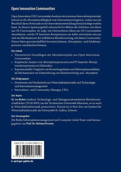 Absorptive Capacity ist der limitierende Faktor für die Nutzung des quasi unerschöpflichen Innovationspotenzials von Open Innovation Communities. In vier Fallstudien untersucht Ivo Blohm die Selektion von Ideen aus Open Innovation Communities im Kontext der Absorptionsprozesse und -kompetenzen von Community-Betreibern. Anhand der Fallstudien zeigt der Autor, wie Community-Betreiber Ideen aus Open Innovation Communities absorbieren, welche IT-basierte Kompetenzen dafür entwickelt werden müssen und wie Mechanismen derkollektiven Ideenbewertung, mit denen Community-Nutzer Ideen gemeinschaftlich bewerten können, die Prozesse der Ideenselektion und -absorption vereinfachen. Die Gestaltung solcher Bewertungsmechanismen wird in drei Experimenten evaluiert, in denen Klassifikationsgüte und Akzeptanz von Bewertungsskalen und Informationsmärkten verglichen werden.