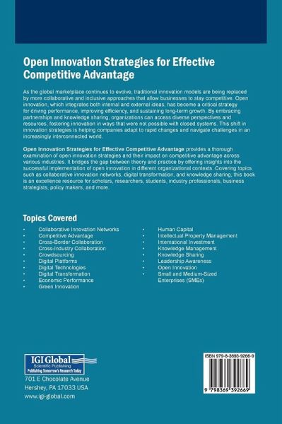 As the global marketplace continues to evolve, traditional innovation models are being replaced by more collaborative and inclusive approaches that allow businesses to stay competitive. Open innovation, which integrates both internal and external ideas, has become a critical strategy for driving performance, improving efficiency, and sustaining long-term growth. By embracing partnerships and knowledge sharing, organizations can access diverse perspectives and resources, fostering innovation in ways that were not possible with closed systems. This shift in innovation strategies is helping companies adapt to rapid changes and navigate challenges in an increasingly interconnected world. Open Innovation Strategies for Effective Competitive Advantage provides a thorough examination of open innovation strategies and their impact on competitive advantage across various industries. It bridges the gap between theory and practice by offering insights into the successful implementation of open innovation in different organizational contexts. Covering topics such as collaborative innovation networks, digital transformation, and knowledge sharing, this book is an excellence resource for scholars, researchers, students, industry professionals, business strategists, policy makers, and more.