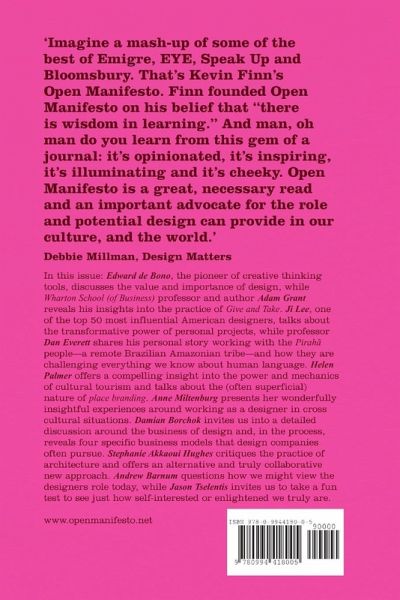 Open Manifesto is an independent journal of critical writing, which focuses on the intersection of design with social, cultural, political and economic issues. In issue 7, Edward de Bono discusses the value and importance of design, while, Adam Grant reveals his insights into the practice of Give and Take. Ji Lee, talks about the transformative power of personal projects, while Dan Everett shares his personal story working with a remote Brazilian Amazonian tribe. Helen Palmer offers insight into the power and mechanics of cultural tourism and Anne Miltenburg presents her experiences working as a designer in cross-cultural situations. Damian Borchok holds a detailed discussion around the business of design. Stephanie Akkaoui Hughes critiques the practice of architecture. Andrew Barnum questions how we might view the designer's role today, while Jason Tselentis tests just how self-interested or enlightened we truly are.