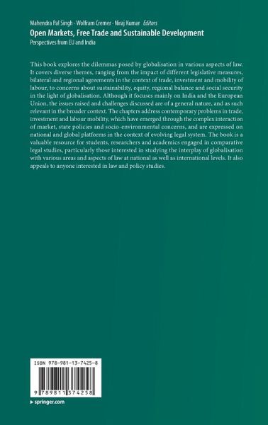 About the Indo-German Conference (Helmut Goerlich & M.P. Singh).- 1. Introduction (Amitabh Kundu).- Part I- Social Market Economy.- 2. Social Rights in the European and the Indian Union (Joerg Luther).- 3. Transitioning from the Informal to the Formal economy: The Continuing Relevance of State Law (Kamala Sankaran).- Part II- Markets and Cultural Diversity.- 4. Open Markets and Diversity of India's Politico-legal Ordering (Amar Pal Singh).- 5. A Peasant's Imagination of Alternative Legal Order: Land Reform in India, Food Security and the WTO (Pratyush Kumar and Andreas Buser).- Part III- Market Liberalisation and Sustainable Development.- 6. India in pursuit of Sustainable Development (A. Jayagovind).- 7. From Social Market Economy to a Sustainable Market Economy (Michael von Hauff).- 8. Environment and Globalisation: Antogonistic or Agnostic (Niraj Kumar).- 9. Sustainable Public Procurement in Europe: Creating Markets or Distorting the Internal Market (Rike Krämer-Hoppe).- Part IV: Co-operation between Indian and the European Union.- 10. The EU-India Development Partnership - Legal framework and political perspectives (Markus Kaltenborn).- 11. Access to Services in the EU Market: With specific focus on Movement of Natural Persons (R.V. Anuradha & Ronjini Ray).- Part V: Market Liberalisation in Goods and Services.- 12. Free Trade Agreements and national constitutional law - from CETA and TTIP onwards (Ralph Zimmermann).- 13. Common Market under the Constitution of India (Uday Shankar).- 14. National Treatment Obligation under Article 3 of GATT vis-à-vis Indian Constitution (Sanjay Jain).- Part VI: Market: Freedom of Establishment and Free Movement of Capital.- 15. Capital Flows into India - Role of Monetary Transfer Provisions in India's International Investment Agreements (Prabhash Ranjan).- 16. LegalRisks in Foreign Direct Investment in India (Anil Rai).- Valedictory and Concluding Remarks (Upendra Baxi).