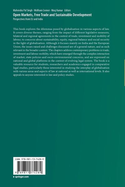 About the Indo-German Conference (Helmut Goerlich & M.P. Singh).- 1. Introduction (Amitabh Kundu).- Part I- Social Market Economy.- 2. Social Rights in the European and the Indian Union (Joerg Luther).- 3. Transitioning from the Informal to the Formal economy: The Continuing Relevance of State Law (Kamala Sankaran).- Part II- Markets and Cultural Diversity.- 4. Open Markets and Diversity of India's Politico-legal Ordering (Amar Pal Singh).- 5. A Peasant's Imagination of Alternative Legal Order: Land Reform in India, Food Security and the WTO (Pratyush Kumar and Andreas Buser).- Part III- Market Liberalisation and Sustainable Development.- 6. India in pursuit of Sustainable Development (A. Jayagovind).- 7. From Social Market Economy to a Sustainable Market Economy (Michael von Hauff).- 8. Environment and Globalisation: Antogonistic or Agnostic (Niraj Kumar).- 9. Sustainable Public Procurement in Europe: Creating Markets or Distorting the Internal Market (Rike Krämer-Hoppe).- Part IV: Co-operation between Indian and the European Union.- 10. The EU-India Development Partnership - Legal framework and political perspectives (Markus Kaltenborn).- 11. Access to Services in the EU Market: With specific focus on Movement of Natural Persons (R.V. Anuradha & Ronjini Ray).- Part V: Market Liberalisation in Goods and Services.- 12. Free Trade Agreements and national constitutional law - from CETA and TTIP onwards (Ralph Zimmermann).- 13. Common Market under the Constitution of India (Uday Shankar).- 14. National Treatment Obligation under Article 3 of GATT vis-à-vis Indian Constitution (Sanjay Jain).- Part VI: Market: Freedom of Establishment and Free Movement of Capital.- 15. Capital Flows into India - Role of Monetary Transfer Provisions in India's International Investment Agreements (Prabhash Ranjan).- 16. LegalRisks in Foreign Direct Investment in India (Anil Rai).- Valedictory and Concluding Remarks (Upendra Baxi).