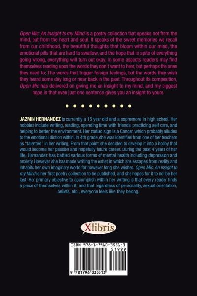 Open Mic: An Insight to My Mind is a poetry collection that speaks not from the mind but from the heart and soul. It speaks of the sweet memories we recall from our childhood, the beautiful thoughts that bloom within our minds, the emotional pills that are hard to swallow, and the hope that in spite of everything going wrong, everything will turn out okay. In some aspects, readers may find themselves reading upon the words they don't want to hear but perhaps need to hear, which trigger foreign feelings-words they wish they had heard back in the past. Throughout its composition, Open Mic has delivered on giving me an insight to my mind, and my biggest hope is that even just one sentence gives you an insight into yours.