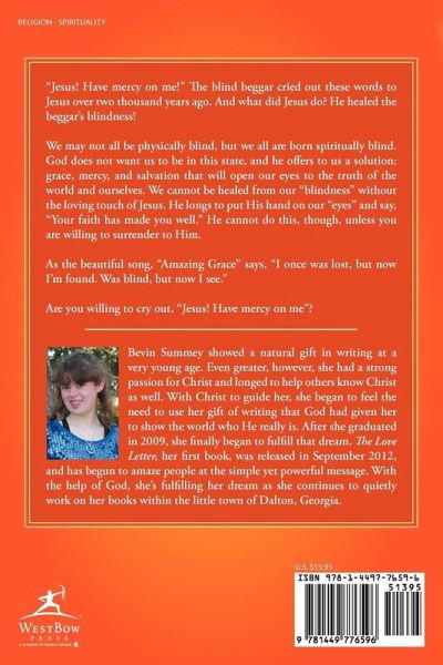 "Jesus! Have mercy on me!" The blind beggar cried out these words to Jesus over two thousand years ago. And what did Jesus do? He healed the beggar’s blindness! We may not all be physically blind, but we all are born spiritually blind. God does not want us to be in this state, and he offers to us a solution: grace, mercy, and salvation that will open our eyes to the truth of the world and ourselves. We cannot be healed from our "blindness" without the loving touch of Jesus. He longs to put His hand on our "eyes" and say, "Your faith has made you well." He cannot do this, though, unless you are willing to surrender to Him. As the beautiful song, "Amazing Grace" says, "I once was lost, but now I’m found. Was blind, but now I see." Are you willing to cry out, "Jesus! Have mercy on me"?