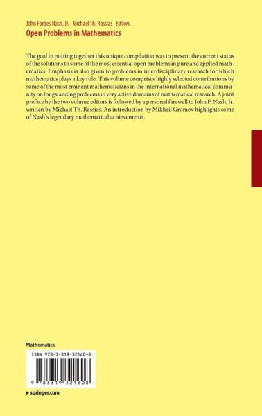 Preface (J.F. Nash, Jr., M.Th. Rassias).- Introduction (M. Gromov).- 1. P Versus NP (S. Aaronson).- 2. From Quantum Systems to L-Functions: Pair Correlation Statistics and Beyond (O. Barrett, F.W.K. Firk, S.J. Miller, C. Turnage-Butterbaugh).- 3. The Generalized Fermat Equation (M. Bennett, P. Mihailescu, S. Siksek).- 4. The Conjecture of Birch and Swinnerton-Dyer (J. Coates).- 5. An Essay on the Riemann Hypothesis (A. Connes).- 6. Navier Stokes Equations (P. Constantin).- 7. Plateau's Problem (J. Harrison, H. Pugh).- 8. The Unknotting Problem (L.H. Kauffman).- 9. How Can Cooperative Game Theory Be Made More Relevant to Econimics? (E. Maskin).- 10. The Erdös-Szekeres Problem (W. Morris, V. Soltan).- 11. Novikov's Conjecture (J. Rosenberg).- The Discrete Logarithm Problem (R. Schoof).- 13. Hadwiger's Conjecture (P. Seymour).- 14. The Hadwiger-Nelson Problem (A. Soifer).- 15. Erdös's Unit Distance Problem (E. Szemerédi).- 16. Goldbach's Conjectures (R.C. Vaughan).- 17. The Hodge Conjecture (C. Voisin).