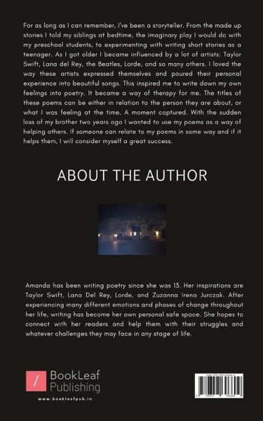 For as long as I can remember, I've been a storyteller. From the made up stories I told my siblings at bedtime, the imaginary play I would do with my preschool students, to experimenting with writing short stories as a teenager. As I got older I became influenced by a lot of artists: Taylor Swift, Lana del Rey, the Beatles, Lorde, and so many others. I loved the way these artists expressed themselves and poured their personal experience into beautiful songs. This inspired me to write down my own feelings into poetry. It became a way of therapy for me. The titles of these poems can be either in relation to the person they are about, or what I was feeling at the time. A moment captured. With the sudden loss of my brother two years ago I wanted to use my poems as a way of helping others. If someone can relate to my poems in some way and if it helps them, I will consider myself a great success.