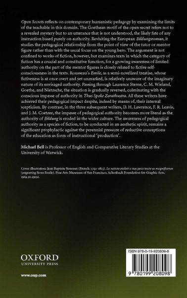 * Introduction: the 'Open Secret' and the Pedagogical Circle * Part I * 1: Imaginary Authority in Rousseau's Emile * 2: The Comedy of Educational Errors: (A) Sterne's Tristram Shandy * 3: and (B) C. M. Wieland's History of Agathon * 4: Goethe's 'Open Secrets:' Wilhelm Meister's Apprenticeship * 5: Pedagogy, Fiction and the Art of Renunciation: Wilhelm Meister's Journeymanship, or the Renunciants * 6: Nietzsche as Educator and the Implosion of Bildung * Part II * 7: 'The passion of instruction:' D. H. Lawrence and 'Wholeness' versus Bildung * 8: The Importance of being Frank: Criticism, Collaboration and Pedagogy in F. R. Leavis * 9: The Lecturer, the Novelist, and the Limits of Persuasion: Elizabeth Costello and J. M. Coetzee on The Lives of Animals and Men * Conclusion