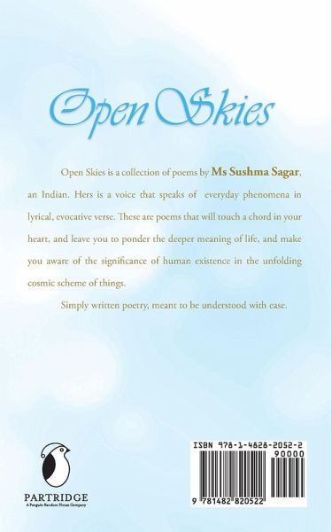 Open Skies is a collection of poems by Ms Sushma Sagar, an Indian. Hers is a voice that speaks of everyday phenomena in lyrical, evocative verse. These are poems that will touch a chord in your heart, and leave you to ponder the deeper meaning of life, and make you aware of the significance of human existence in the unfolding Cosmic scheme of things. Simply written poetry, meant to be understood with ease.