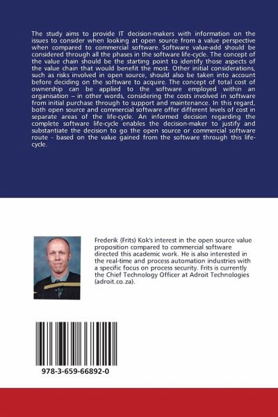 The study aims to provide IT decision-makers with information on the issues to consider when looking at open source from a value perspective when compared to commercial software. Software value-add should be considered through all the phases in the software life-cycle. The concept of the value chain should be the starting point to identify those aspects of the value chain that would benefit the most. Other initial considerations, such as risks involved in open source, should also be taken into account before deciding on the software to acquire. The concept of total cost of ownership can be applied to the software employed within an organisation in other words, considering the costs involved in software from initial purchase through to support and maintenance. In this regard, both open source and commercial software offer different levels of cost in separate areas of the life-cycle. An informed decision regarding the complete software life-cycle enables the decision-maker to justify and substantiate the decision to go the open source or commercial software route - based on the value gained from the software through this life-cycle.