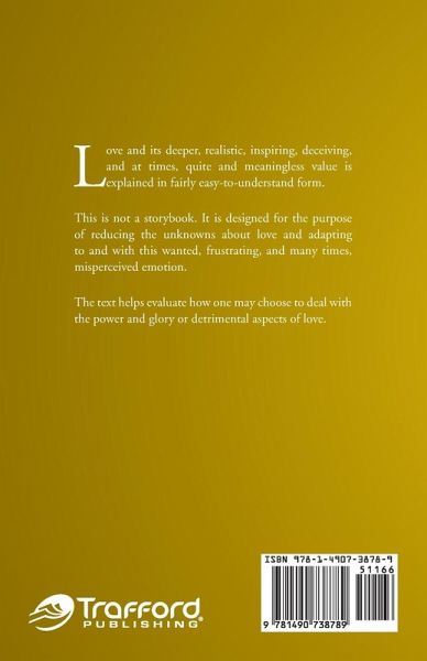 Love and its deeper, realistic, inspiring, deceiving, and at times, quite and meaningless value is explained in fairly easy-to-understand form. This is not a storybook. It is designed for the purpose of reducing the unknowns about love and adapting to and with this wanted, frustrating, and many times, misperceived emotion. The text helps evaluate how one may choose to deal with the power and glory or detrimental aspects of love.