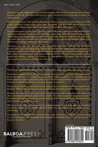 This book is meant to enlighten those who have been struggling with rising up from existential crisis and finding the purpose of their life. The authors of the book have put in a lot of hard work and many years of research in writing this book. This book wisely answers all the questions regarding our existence; it provides an insight into the nature of the complex mechanisms of human beings and the origin of everything. It explains how the bounties of nature and their incredibly intelligent designs speak for the existence of God without uttering words. The supernatural power, in other words, God the viewed differently by individuals of different backgrounds depending on their social conditioning. The writer further explains to the truth-seekers as to how find and connect with the higher power by means of different practices such as meditation, channeling, yoga, prayers, and it sheds light on the incredible power of positive thinking. It also addresses the detrimental effects of low self-esteem and negativity in realizing our full potential. The book is not an endeavor of one mind. It is a by-product of the amalgamation of different minds and different life experiences. One of the authors of the book has gone through many mystical experiences that ended up making her a spiritual healer from being a therapist. The book mentions many various ancient treatments such as reiki, chakras, massage etc to live peacefully and mindfully. The writers of this insightful book have avoided using highfalutin vocabulary for its readers to be understandable by layman. I hope this book will find a way to your hearts and will shatter all your illusions.