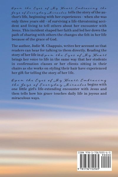 Open the Eyes of My Heart: Embracing the Joys of Everyday Miracles tells the story of the author's life, beginning with her experience when she was only three years old of surviving a life-threatening accident and living to tell others about her encounter with Jesus. This incident shaped her faith and led her down the path of sharing with others the changes she felt in her life because of the grace of God. The author, Jodie M. Chappuis, writes her account so that readers can hear her talking to them directly. Reading the story of her life in Open the Eyes of My Heart brings her voice to life in the same way that her students in confirmation classes or her clients sitting in their chairs as she works on styling their hair have experienced her gift for telling the story of her life. Open the Eyes of My Heart: Embracing the Joys of Everyday Miracles begins with one little girl's life-extending encounter with Jesus and then tells how his grace touches daily life in joyous and miraculous ways.