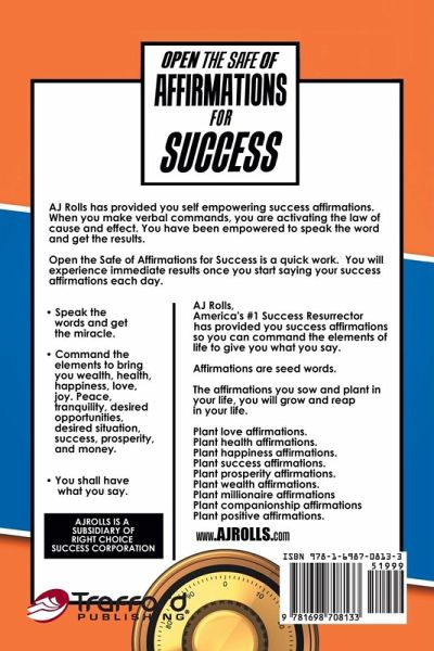 AJ Rolls has provided you self empowering success affirmations. When you make verbal commands, you are activating the law of cause and effect. You have been empowered to speak the word and get the results. Open the Safe of Affirmations for Success is a quick work. You will experience immediate results once you start saying your success affirmations each day. ¿ Speak the words and get the miracle. ¿ Command the elements to bring you wealth, health, happiness, love, joy. Peace, tranquility, desired opportunities, desired situation, success, prosperity, and money. ¿ You shall have what you say.