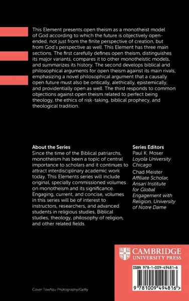 "This Element shows Open theism as a monotheist model of God according to which the future is objectively open-ended, not just from the finite perspective of creation, but from God's perspective as well. This Element has three main sections. The first carefully defines open theism, distinguishes its major variants, compares it to other monotheistic models, and summarizes its history. The second develops biblical and philosophical arguments for open theism against its main rivals, emphasizing a novel philosophical argument that a causally open future must also be ontically, alethically, epistemically, and providentially open as well. The third responds to common objections against open theism related to perfect being theology, the ethics of risk-taking, biblical prophecy, and theological tradition"--
