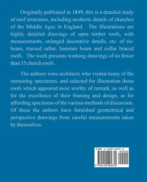 Originally published in 1849, this is a detailed study of roof structures, including aesthetic details of churches of the Middle Ages in England. The illustrations are highly detailed drawings of open timber roofs, with measurements, enlarged decorative details, etc. of tie-beam, trussed rafter, hammer beam and collar braced roofs. The work presents working drawings of no fewer than 35 church roofs. The authors were architects who visited many of the remaining specimens, and selected for illustration those roofs which appeared most worthy of remark, as well as for the excellence of their framing and design, as for affording specimens of the various methods of discussion. Of these the authors have furnished geometrical and perspective drawings from careful measurements taken by themselves.