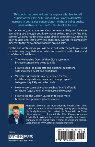 This book has been written for anyone who has to sell as part of their life or business. If you want a dramatic increase in your sales conversions - without being pushy, manipulative or 'hard sell' - this book is for you. But be warned, what you are about to learn is likely to challenge everything you thought you knew about selling. You may find that some of what you read in these pages directly contradicts what you've been taught, and that's why this philosophy works! It's completely different to the conventional wisdom around sales. By the end of this book you will be armed with the tools you need to enter any negotiation or sales conversation with clarity and confidence. You'll learn: The twelve-step Open With A Close system to increase conversions by up to 64% How to speak to prospects and potential customers with increased belief and confidence Why the human brain is programmed for fear, and the six questions you can ask your prospects to bypass it quickly and effectively How to overcome objections such as 'I can't afford it' or 'I haven't got the time' with ease and elegance How to use the Golden Question to close more business and generate greater revenue