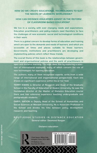 We live in a society with ever-changing needs and expectations. Education practitioners and policy makers need therefore to face the challenges of new economic, social and technological conditions in their work. There is a global concern to develop forms of education and training which are open to the demands of needs of learners, and which are accessible at times and places suitable to those learners. Governments, institutions and practitioners are developing and implementing policies which reflect these trends. The overall theme of this book is the relationship between government and organizational policies and the work of practitioners in open and distance learning. The book does this by exploring a selection of international examples. The authors, many of them recognized experts, write from a wide range of international and organizational perspectives. Each one draws on significant experience within his or her field. Terry Evans is Head of the Graduate School of Education at Deakin University. He was the foundation director of the Master of Distance Education course there and has extensive experience teaching undergraduate and postgraduate students. Daryl Nation is Deputy Head of the School of Humanities and Social Sciences at Monash University. He is Associate Professor in the School and divides his time between policy development, research and teaching.