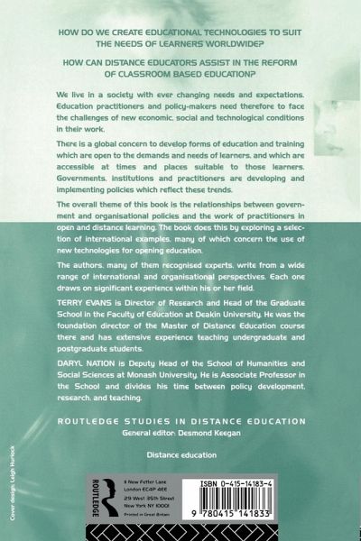 We live in a society with ever-changing needs and expectations. Education practitioners and policy makers need therefore to face the challenges of new economic, social and technological conditions in their work. There is a global concern to develop forms of education and training which are open to the demands of needs of learners, and which are accessible at times and places suitable to those learners. Governments, institutions and practitioners are developing and implementing policies which reflect these trends. The overall theme of this book is the relationship between government and organizational policies and the work of practitioners in open and distance learning. The book does this by exploring a selection of international examples. The authors, many of them recognized experts, write from a wide range of international and organizational perspectives. Each one draws on significant experience within his or her field. Terry Evans is Head of the Graduate School of Education at Deakin University. He was the foundation director of the Master of Distance Education course there and has extensive experience teaching undergraduate and postgraduate students. Daryl Nation is Deputy Head of the School of Humanities and Social Sciences at Monash University. He is Associate Professor in the School and divides his time between policy development, research and teaching.