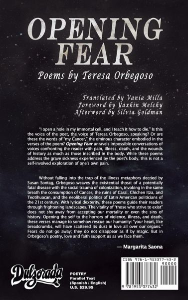 OPENING FEARpoems by Teresa Orbegoso translated by Vania Milla / preface by Margarita Saona / foreword by Yaxkin Melchy / afterword by Silvia Goldman / illustrations by Louise Castillo "I open a hole in my immortal cell, and I teach it how to die." Is this the voice of the poet, the voice of Teresa Orbegoso, speaking? Or are these the words of "my Cancer," the ominous character embodied in the verses of the poem? Opening Fear unravels impossible conversations of voices confronting the reader with pain, illness, death, and the wounds of history as much as those inscribed in the body. While these poems address the grave sickness experienced by the poet's body, this is not a self-involved exploration of one's own pain. Without falling into the trap of the illness metaphors decried by Susan Sontag, Orbegoso weaves the existential threat of a potentially fatal disease with the social trauma of colonization, invoking in the same breath the consumption of Cancer, the ruins of Caral, Chichen Itza, and Teotihuacan, and the neoliberal politics of Latin American politicians of the 21st century. With lyrical dexterity, these poems guide their readers through frightening landscapes. The vitality of "those who strive to exist" does not shy away from accepting our mortality or even the sins of history. Opening the self to the horrors of violence, illness, and death, these verses manage to somehow rescue our humanity: "your heart, like breadcrumbs, will have scattered its dust in love all over our organs." Fears do not go away; they do not disappear as if by magic. But in Orbegoso's poetry, love and faith support us as we face them. - Margarita Saona