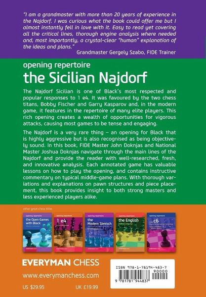 The Najdorf Sicilian is one of Black's most respected and popular responses to 1 e4. It was favoured by those two titans of the game, Bobby Fischer and Garry Kasparov and in the modern game it features in the repertoire of many elite players. This rich opening creates a wealth of opportunities for vigorous attacks, causing most games to be tense and engaging. The Najdorf is that very rare thing - an opening for Black that is highly aggressive but is also recognised as being objectively sound. In this book, FIDE Master John Doknjas and National Master Joshua Doknjas navigate through the main lines of the Najdorf and provide the reader with well-researched, fresh, and innovative analysis. Each annotated game has valuable lessons on how to play the opening, and contains instructive commentary on typical middle-game plans. With thorough variations and explanations on pawn structures and piece placement, this book provides insight to both strong masters and less experienced players alike. The format is ideal for the chessplayer keen to improve their game. While reading you are continually challenged to answer probing questions - a method that greatly encourages the learning and practising of vital skills just as much as the traditional assimilation of chess knowledge. Carefully selected questions and answers are designed to keep you actively involved and allow you to monitor your progress as you learn. This is an excellent way to study chess while providing the best possible chance to retain what has been learnt.