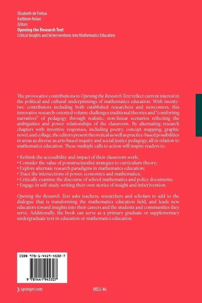Foreword to the Research Text: Mathematics Education Under Cross-Examination.- Best Evidence Research Redefined In Mathematics Education.- Psychosocial Processes in Mathematics Education.- The Teacher as Midwife: what can Mathematics Education Research Learn from Obstetrics?.- Mathematics and Mathematics Education--Deconstructing the Math Wars.- Pinning A Problem in Mathematics Education.- Writing as the Intrusive Third Space.- Opening the Mathematics Text: What Does It Say?.- Huh?!.- Opening up the Text--Starting in the Middle.- Timeless Pleasure.- Comforting Narratives of Compliance: Psychoanalytic Perspectives on New Teacher Responses to Mathematics Policy Reform.- The Promise of Disrupting Comforting Narratives of Compliance.- The (Com)Promises of Disrupting Comforting Narratives of Compliance.- Power Distribution in The Network of Mathematics Education Practices.- A Landscape of Power Distribution.- Living the Landscape with/in A Thrice-Told Tale.- Mathematics Education in A Knowledge Market: Developing Functional and Critical Competencies.- More Than Mark(Et) Driven? Scenes from A Continuing Conversation.- Living Mathematically: A Poet's Response.- Building Political Relationships with Students: an Aspect of Social Justice Pedagogy.- Fear of The Political.- Critiquing Knowledge, Challenging Oppression and Standing in Solidarity in Teacher Education.- A Life for Aprile: Social Justice As A Search of/for the Soul.- Afterword: Bootleg Mathematics.