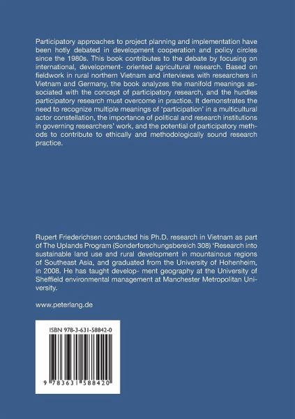 Participatory approaches to project planning and implementation have been hotly debated in development cooperation and policy circles since the 1980s. This book contributes to the debate by focusing on international, development-oriented agricultural research. Based on fieldwork in rural northern Vietnam and interviews with researchers in Vietnam and Germany, the book analyzes the manifold meanings associated with the concept of participatory research, and the hurdles participatory research must overcome in practice. It demonstrates the need to recognize multiple meanings of 'participation' in a multicultural actor constellation, the importance of political and research institutions in governing researchers' work, and the potential of participatory methods to contribute to ethically and methodologically sound research practice.
