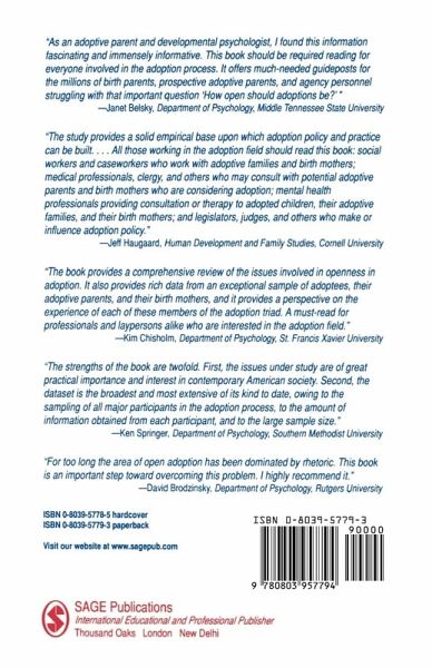Harold Grotevant and Ruth McRoy provide a thorough review of the issues involved in openness in adoption and a clear description of the methods and results of the landmark research project they led. They provide rich data from an exceptional sample of adoptees, their adoptive parents and their birth mothers, and provide a perspective of their experiences as `triangular families' which openness generates. The last chapter reaches some general conclusions and discusses implications for future adoption practice.