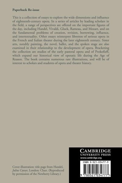 This is a collection of essays to explore the wide dimensions and influence of eighteenth-century opera. In a series of articles by leading scholars in the field, a range of perspectives are offered on the important figures of the day, including Handel, Vivaldi, Gluck, Rameau and Mozart, and on the fundamental problems of creation, revision, borrowing, influence and intertextuality. Other essays reinterpret librettos of serious opera in the French and Italian theatre during the later eighteenth century. Sister arts, notably painting, the novel, ballet and the spoken stage, are also examined in their relationship to the development of opera. Bracketing the collection are studies of the early pastoral opera and of Prokofiev, which expand our historical view of operatic life during the Age of Reason. The book contains numerous rare illustrations, and will be of interest to scholars and students of opera and theatre history.