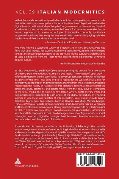 In 1962, Umberto Eco published Opera aperta, setting the ground for a new wave of creative experimentation across the arts and media. The concept of «open work» - informed by systems theory, cybernetics, relativism, pragmatism and other influential disciplines of the time - was used by Eco to reconsider the work of art as a site for interactivity, collaboration and intermediality. Starting from this perspective, this book reconstructs the history of Italian electronic literature, looking at creative practices across literature, electronic and digital media from the early days of computers to the social media age. It examines how Italian writers, poets, literary critics and intellectuals have responded to each phase of the digital revolution, by enacting «poetics of openness» and «politics of intermediality». Case studies include Nanni Balestrini, Gianni Toti, Italo Calvino, Caterina Davinio, Wu Ming, Michela Murgia, Francesco Pecoraro, Roberto Saviano, Tommaso Pincio, Fabio Viola, Fabrizio Venerandi and Enrico Colombini. In some cases, literary experimentation with new technologies has taken a clear polemical stance towards mass media, globalisation, information society and late capitalism, in order to challenge and/or reconfigure artistic or social ontologies. In others, digital technologies have been used to enhance and extend the parameters and «languages» of literature.