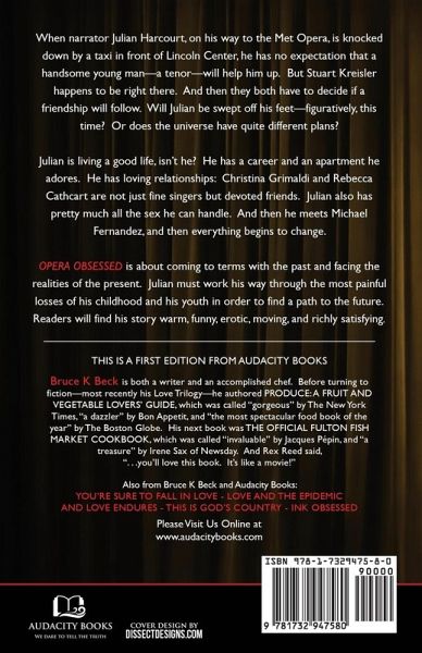 When narrator Julian Harcourt, on his way to the Met Opera, is knocked down by a taxi in front of Lincoln Center, he has no expectation that a handsome young man-a tenor-will help him up. But Stuart Kreisler happens to be right there. And then they both have to decide if a friendship will follow. Will Julian be swept off his feet-figuratively, this time? Or does the universe have quite different plans? Julian is living a good life, isn't he? He has a career and an apartment he adores. He has loving relationships: Christina Grimaldi and Rebecca Cathcart are not just fine singers but devoted friends. Julian also has pretty much all the sex he can handle. And then he meets Michael Fernandez, and then everything begins to change. OPERA OBSESSED is about coming to terms with the past and facing the realities of the present. Julian must work his way through the most painful losses of his childhood and his youth in order to find a path to the future. Readers will find his story warm, funny, erotic, moving, and richly satisfying.