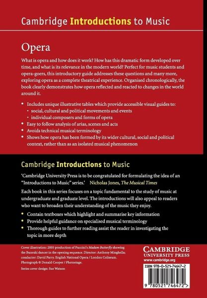 Introduction; Part I: 1. Pre-operatic forms; 2. First operatic forms: Peri, Caccini, Monteverdi, Cavalli, Keiser; 3. Formalization; 4. Reform - the reintegration of elements; 5. Comedy and the 'real world'; 6. 'Authentic' performance; Part II: 7. Romanticism and romantic opera in Germany; 8. Opera in nineteenth-century Italy; 9. Grand Opéra and the visual language of opera; 10. The Wagnerian revolution; 11. Nationalists: vernacular language and music; 12. The role of the singer; Part III: 13. The turn of the century and the crisis in opera; 14. First modernism: symbolist and expressionist opera; 15. The dramaturgy of opera: libretto - words and structure; 16. Narrative opera: realistic and non-realistic; 17. Radical narratives; 18. Directors and the direction of opera; Appendices: 1. Motifs from Der Ring; 2. The development of singing voices; 3. The development of lyric theatre alternatives to 'opera'; 4. Some major operas, artistic and political events of the twentieth century; Glossary of terms; Bibliography.