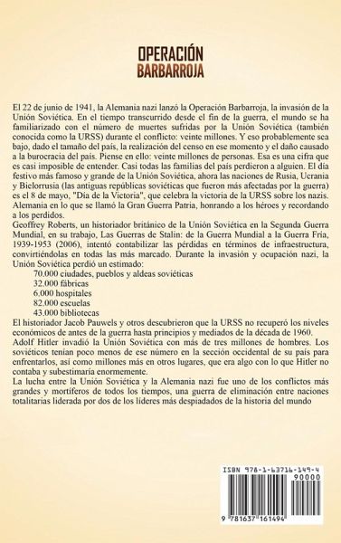 Si quiere descubrir la fascinante historia de la Operación Barbarroja, siga leyendo... El 22 de junio de 1941, la Alemania nazi lanzó la Operación Barbarroja, la invasión de la Unión Soviética. En el tiempo transcurrido desde el fin de la guerra, el mundo se ha familiarizado con el número de veinte millones de muertes sufridas por la Unión Soviética (también conocida como la URSS). Y este probablemente sea un número aún menor, dado el censo que se está llevando en ese momento y el daño causado a la burocracia del país. Adolf Hitler invadió la Unión Soviética con más de tres millones de hombres. Los soviéticos tenían poco menos de ese número en la parte occidental de su país para enfrentarlos, así como millones más en otros lugares, que era algo con lo que Hitler no contaba y que manifiestamente subestimaría. La lucha entre la Unión Soviética y la Alemania nazi fue uno de los conflictos más grandes y mortíferos de todos los tiempos, una guerra de eliminación entre naciones totalitarias dirigida por dos de los líderes más despiadados de la historia del mundo. En Operación Barbarroja: Una Guía Fascinante de los Primeros Meses de la Guerra entre Hitler y la Unión Soviética entre 1941-1945, descubrirá temas como:Nazis y Comunistas Invasión Todo Parece Perdido ¡Y mucho, mucho más! ¡Obtenga este el libro ahora para aprender más sobre la Operación Barbarroja!