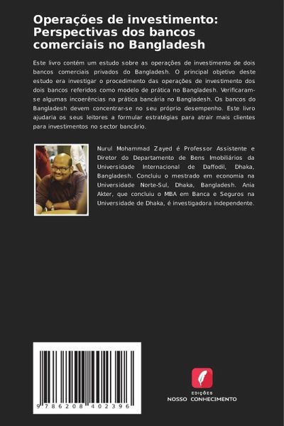 Este livro contém um estudo sobre as operações de investimento de dois bancos comerciais privados do Bangladesh. O principal objetivo deste estudo era investigar o procedimento das operações de investimento dos dois bancos referidos como modelo de prática no Bangladesh. Verificaram-se algumas incoerências na prática bancária no Bangladesh. Os bancos do Bangladesh devem concentrar-se no seu próprio desempenho. Este livro ajudaria os seus leitores a formular estratégias para atrair mais clientes para investimentos no sector bancário.