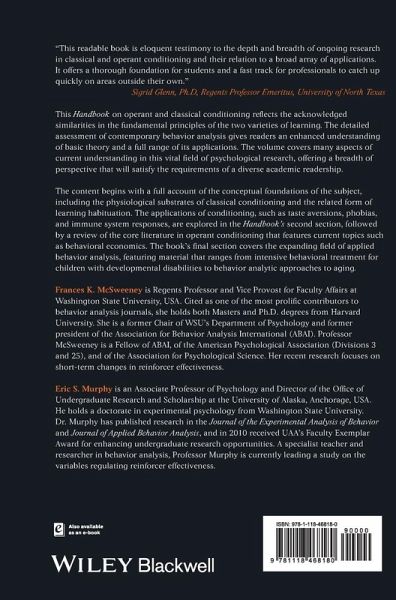 Frances K. McSweeney is Regents Professor and Vice Provost for Faculty Affairs at Washington State University, USA. Cited as one of the most prolific contributors to behaviour analysis journals, she holds both Masters and Ph.D. degrees from Harvard University. The former Chair of WSU's Department of Psychology and of the Association for Behavior Analysis International (ABAI). Professor McSweeney is a fellow of ABAI, of the American Psychological Association (Divisions 3 and 25), and of the Association for Psychological Science. Her recent research focuses on short-term changes in reinforcer effectiveness. Eric S. Murphy is Associate Professor in the Department of Psychology at the University of Alaska Anchorage, USA, and holds a doctorate in experimental psychology from Washington State University. He has published research in the Journal of the Experimental Analysis of Behavior and Journal of Applied Behavior Analysis, and in 2010 received UAA's Faculty Exemplar Award for enhancing undergraduate research opportunities. A specialist teacher and researcher in behavior analysis, Dr Murphy is currently leading a study of the variables regulating reinforcer effectiveness.
