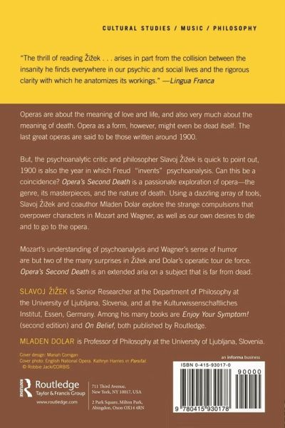 This work explores the relationship between opera and psychoanalysis. Ziezek and Dolar consider, for example, death in opera and orgasm (the little death for which opera may be imagined to be a substitution), as well as the heralded "death of opera" and its cultural function.