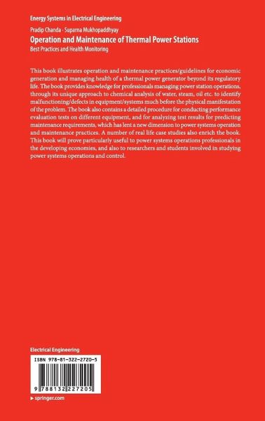 This book illustrates operation and maintenance practices/guidelinesfor economic generation and managing health of a thermal power generator beyondits regulatory life. The book provides knowledge for professionals managing powerstation operations, through its unique approach to chemical analysis of water, steam,oil etc. to identify malfunctioning/defects in equipment/systems much before thephysical manifestation of the problem. The book also contains a detailed procedurefor conducting performance evaluation tests on different equipment, and for analyzingtest results for predicting maintenance requirements, which has lent a new dimensionto power systems operation and maintenance practices. A number of real life casestudies also enrich the book. This book will prove particularly useful to powersystems operations professionals in the developing economies, and also to researchersand students involved in studying power systems operations and control.