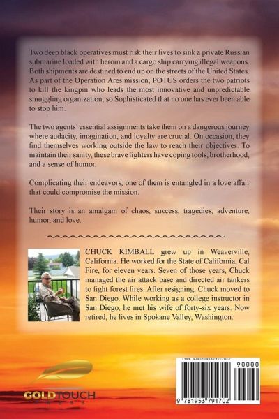 Two deep black operatives must risk their lives to sink a private Russian submarine loaded with heroin and a cargo ship carrying illegal weapons. Both shipments are destined to end up on the streets of the United States. As part of the Operation Ares mission, POTUS orders the two patriots to kill the kingpin who leads the most innovative and unpredictable smuggling organization, so sophisticated that no one has ever been able to stop him. The two agents' essential assignments take them on a dangerous journey where audacity, imagination, and loyalty are crucial. On occasion, they find themselves working outside the law to reach their objectives. To maintain their sanity, these brave fighters have coping tools, brotherhood, and a sense of humor. Complicating their endeavors, one of them is entangled in a love affair that could compromise the mission. Their story is an amalgam of chaos, success, tragedies, adventure, humor, and love.