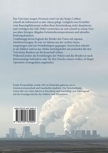 Der Tod eines jungen Neonazis wird von der Kripo Cottbus schnell als Selbstmord zu den Akten gelegt. Lediglich zwei Ermittler vom Rauschgiftdezernat wollen diese Entscheidung nicht akzeptieren und verfolgen den Fall entgegen konkreter Anweisungen von oben weiter. Dabei verstricken sie sich schnell in einem Netz aus alten Intrigen, illegalen Geheimdienstoperationen und aktueller Bodenspekulation.Unabhängig davon beginnt der Bruder des Toten mit eigenen Nachforschungen. Er war vor Jahren aus der rechten Szene ausgestiegen und zur Fremdenlegion gegangen. Inzwischen arbeitet er als Söldner und ist aus Afrika zurückgekehrt um jemanden für den Tod seines Bruders zur Rechenschaft ziehen.Während andere die Ermittlungen der Polizei und des Bruders je nach Interessenlage behindern oder für ihre Zwecke nutzen wollen, ist längst Operation Armageddon angelaufen.