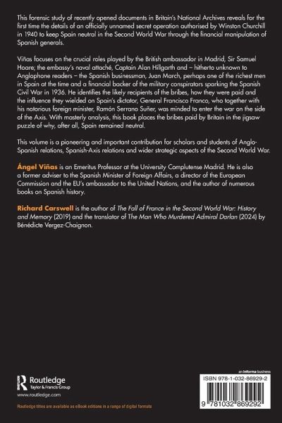 Viñas focuses on the crucial roles played by the British ambassador in Madrid, Sir Samuel Hoare; the embassy's naval attaché, Captain Alan Hillgarth and - hitherto unknown to Anglophone readers - the Spanish businessman, Juan March, perhaps one of the richest men in Spain at the time and a financial backer of the military conspirators sparking the Spanish Civil War in 1936. He identifies the likely recipients of the bribes, how they were paid and the influence they wielded on Spain's dictator, General Francisco Franco, who together with his notorious foreign minister, Ramón Serrano Suñer, was minded to enter the war on the side of the Axis. With masterly analysis, this book places the bribes paid by Britain in the jigsaw puzzle of why, after all, Spain remained neutral.