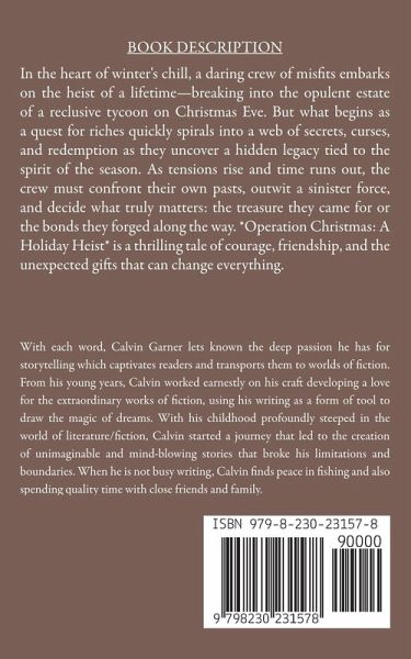 In the heart of winter's chill, a daring crew of misfits embarks on the heist of a lifetime-breaking into the opulent estate of a reclusive tycoon on Christmas Eve. But what begins as a quest for riches quickly spirals into a web of secrets, curses, and redemption as they uncover a hidden legacy tied to the spirit of the season. As tensions rise and time runs out, the crew must confront their own pasts, outwit a sinister force, and decide what truly matters: the treasure they came for or the bonds they forged along the way. *Operation Christmas: A Holiday Heist* is a thrilling tale of courage, friendship, and the unexpected gifts that can change everything.