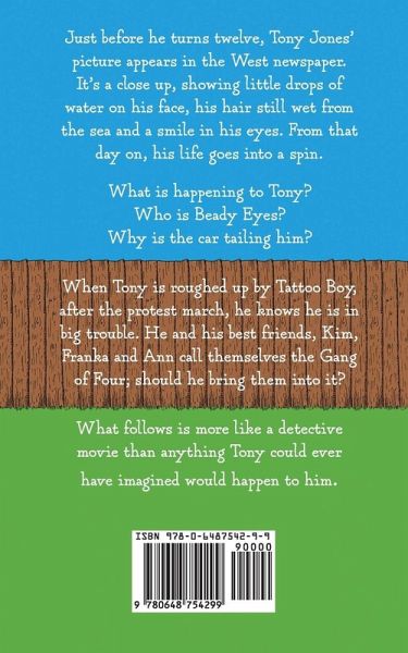 Just before he turns twelve, Tony Jones' picture appears in the West newspaper. It's a close up, showing little drops of water on his face, his hair still wet from the sea and a smile in his eyes. From that day on, his life goes into a spin. What is happening to Tony? Who is Beady Eyes? Why is the car tailing him? When Tony is roughed up by Tattoo Boy, after the protest march, he knows he is in big trouble. He and his best friends, Kim, Franka and Ann call themselves the Gang of Four; should he bring them into it? What follows is more like a detective movie than anything Tony could ever have imagined would happen to him.